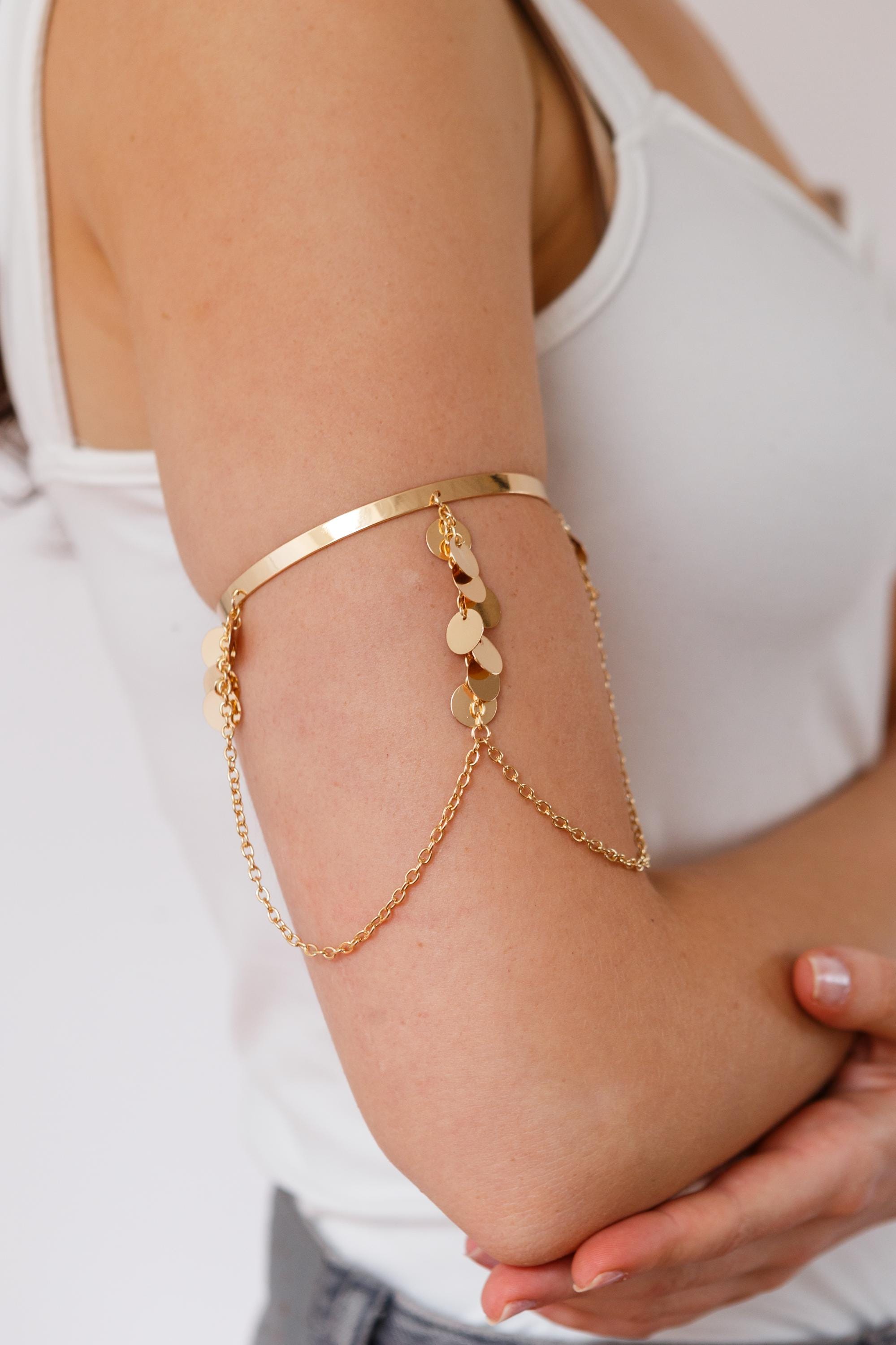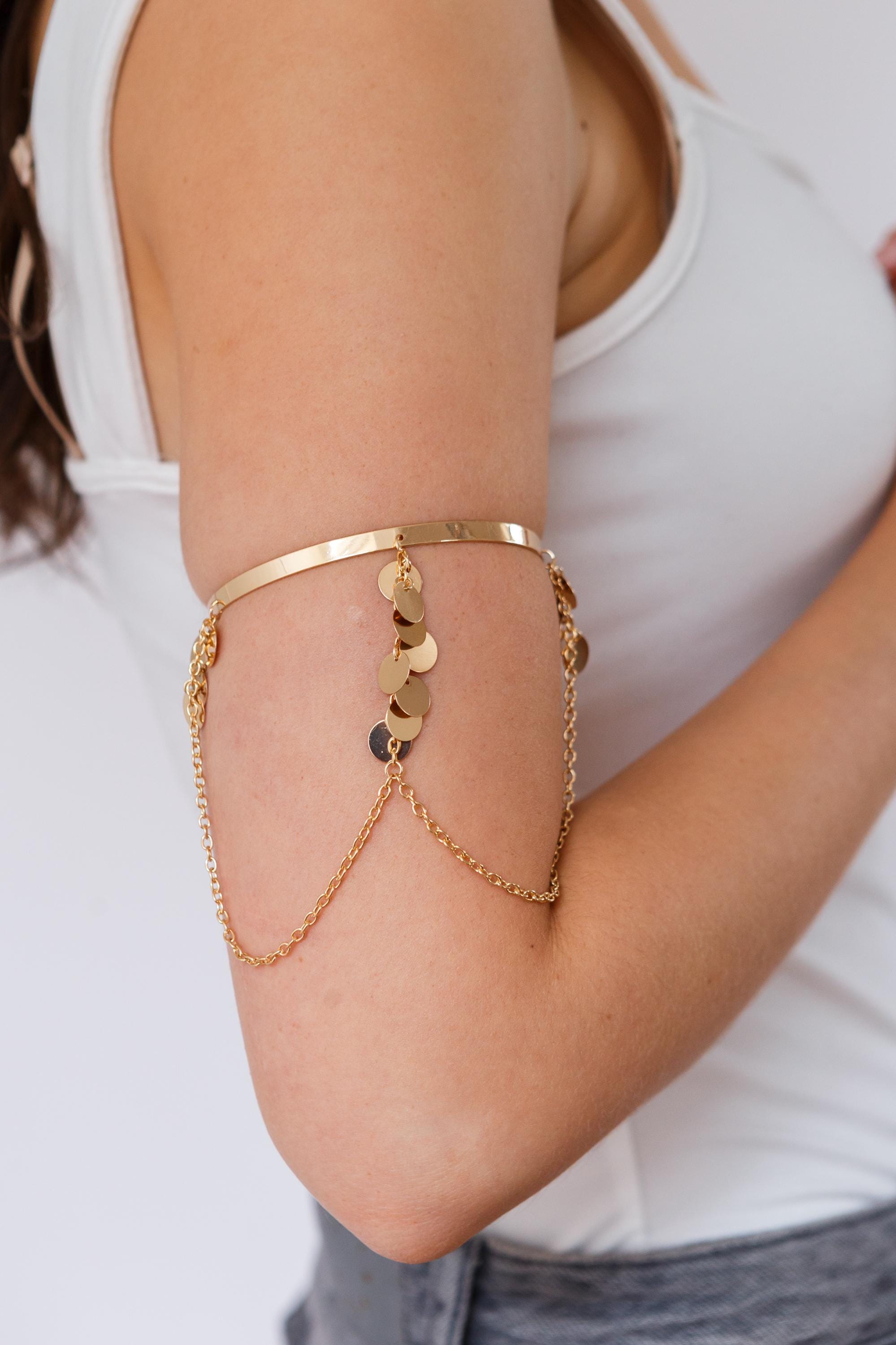 Elevate your boho style with this stunning Gold Chain Draped Upper Arm Cuff — a bold, elegant armlet designed to make a statement. Crafted in a warm gold tone, the cuff features beautifully layered draping chains that fall softly around the upper arm for a flowing, feminine look.