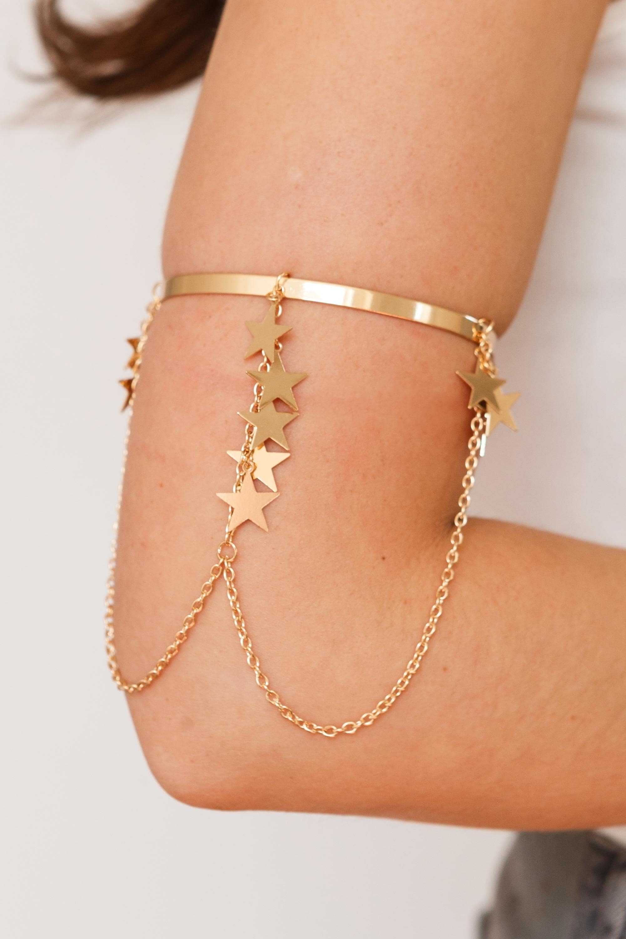 Delicate star charms fall beautifully down the arm, creating an eye-catching boho look perfect for festivals, summer outfits, goddess-inspired styles, or night-out glam.