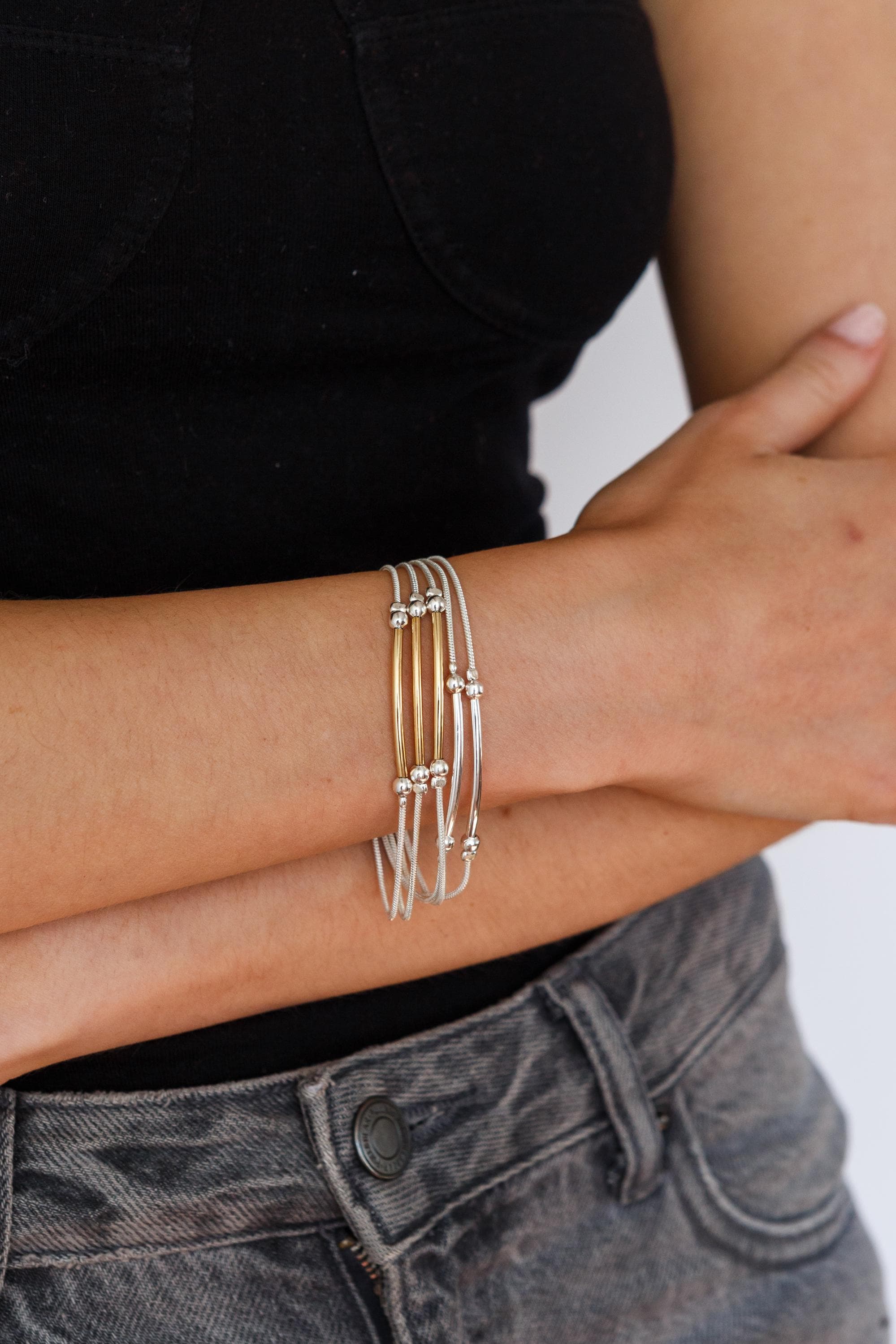 A beautiful multi layered silver bracelet dotted with silver and rose balls.